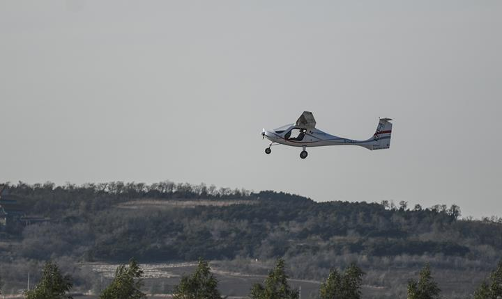 11月1日,飞行员驾驶RX1E-A型飞机飞行。当日,由沈阳航空航天大学自主设计研发的增程电动双座RX1E-A型飞机在沈阳财湖机场成功实现首飞。这一机型较上一代将续航时间从45分钟左右增加到2小时的同时,还增加了整体式降落伞,是我国在电动通用航空领域取得的又一突破性进展。