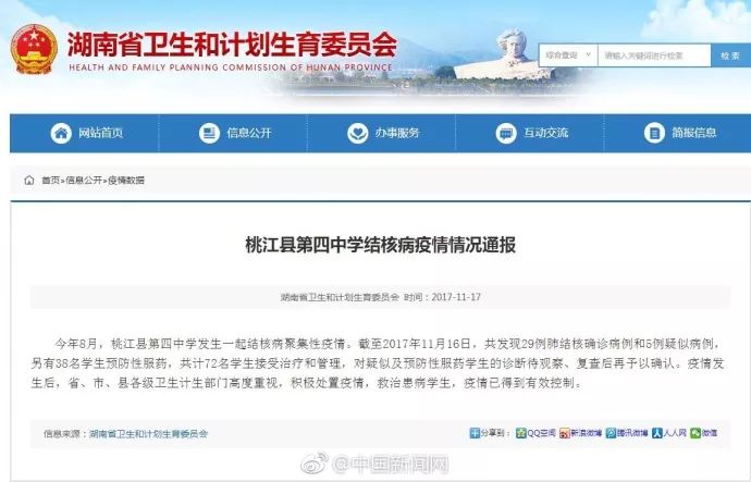 8月湖南桃江四中发生一起结核病聚集性疫情。截至16日,共72名学生接受治疗和管理。目前疫情已得到有效控制。国家卫计委相关工作人员和防治专家已到达湖南省桃江县督导当地疫情处置工作。