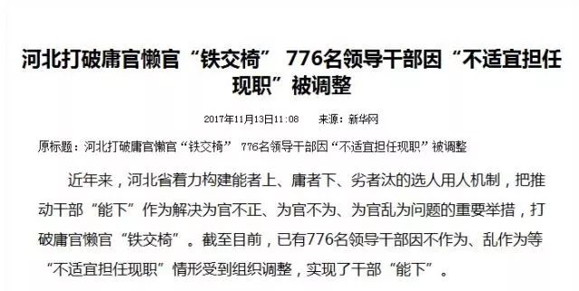 以河北省为例,该省已有776名领导干部因不作为、乱作为等“不适宜担任现职”情形受到组织调整,公职岗位再也不是贪官庸官的“铁交椅”。