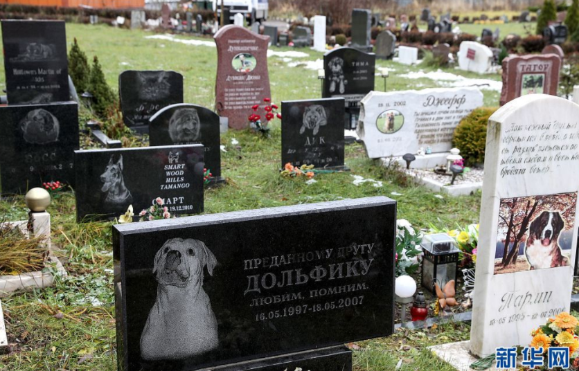 俄罗斯莫斯科宠物公墓内的墓碑照片。现代民众对家庭宠物十分重视,许多家庭会为它们举办正式葬礼,并将它们埋葬在这样的宠物公墓作为纪念。