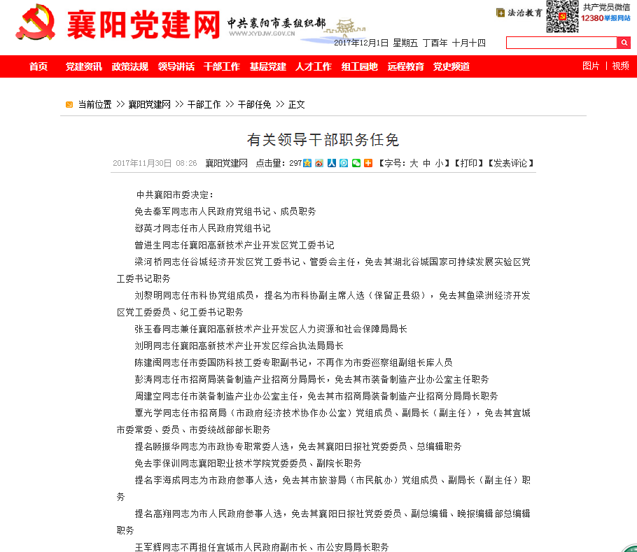 11月30日,中共襄阳市委组织部官网公布襄阳有关领导职务任免的通知,详情点击【阅读原文】