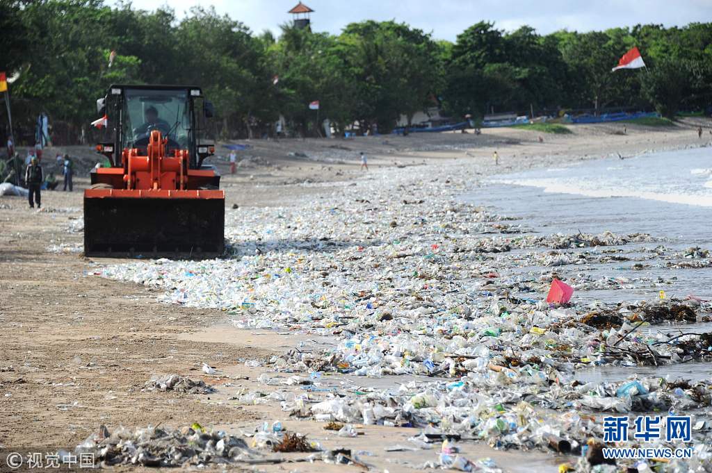 近日,印度尼西亚登巴萨,在当地的库塔海滩上堆满了各种各样的垃圾,由于旅游带来的环境问题在巴厘岛正日益突出。