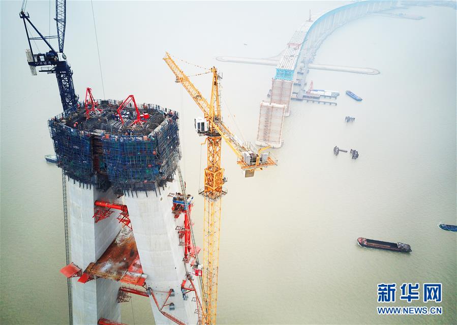 12月28日,工人在沪通长江大桥28号主墩施工现场施工。当日,沪通长江大桥28号主墩中塔柱成功合龙。中塔柱合龙之后,即将开启上塔柱施工模式。沪通长江大桥是我国沿海铁路大通道中沪通(上海——南通)铁路段的跨长江控制性工程,主桥采用双塔斜拉桥设计,主跨1092米,为目前世界上最大跨度的公铁两用斜拉桥。