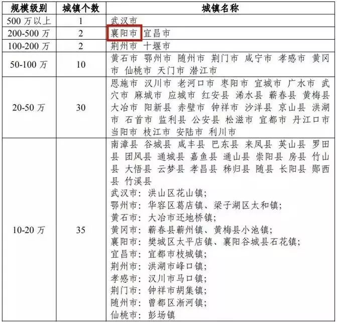 到2020年,湖北省将有500万人以上城市1个,新增200-500万人城市2个、100-200万人城市2个,50-100万人城市由3个增加到10个,20-50万人城市由26个增加到30个,10-20万人城市由34个增加到36个,3-10万人城镇由77个增加到221个,3万以下的城镇由655个减少到480个。