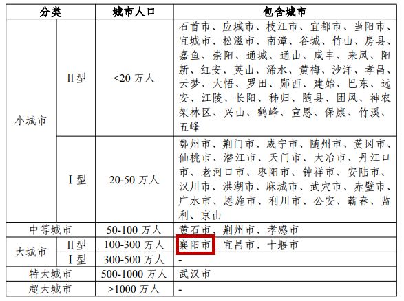 截至2015年底,湖北有特大城市(500-1000万人)1个,大城市(100-500万人)3个,中等城市(50-100万人)3个,I型小城市(20-50万人)26个,II型小城市(<20万人)43个,其中襄阳市属于大城市(100-500万人)。市域范围内,襄阳还拥有I型小城市(20-50万人)2个:老河口市、枣阳市;II型小城市(<20万人)3个:宜城市、南漳县、谷城县。