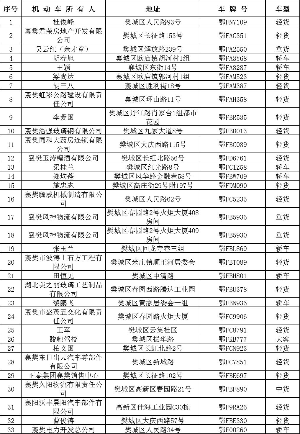 请以上33台黄标车主于2018年2月12日前,将行车证、机动车登记证书、车主身份证(复印件)及交车证明送交襄阳华泰天成再生资源有限责任公司,经办理注销和补贴手续后,车主领取补贴款。如逾期将不再办理补贴事宜。【查看原文】