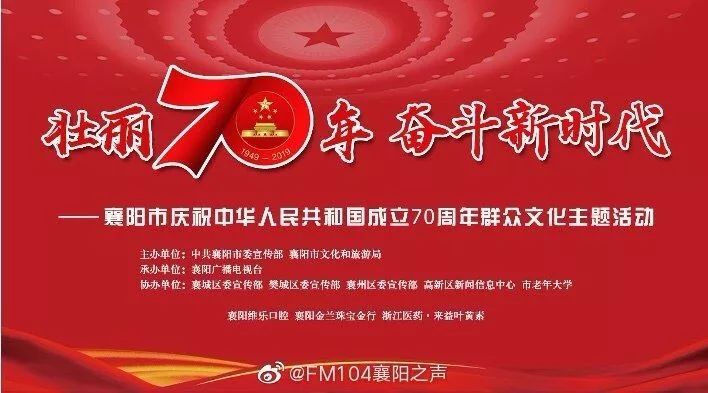 “壮丽70年,奋斗新时代”--襄阳市庆祝中华人民共和国成立70周年群众文化主题活动,将以文艺汇演的形式唱响主旋律,讴歌新时代,展现全市上下建设一极两中心的良好精神风貌,抒发对祖国繁荣强盛的深切祝福。