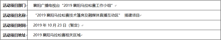 为保障2019襄阳马拉松赛的宣传报道,襄阳广播电视台现就 “2019襄阳马拉松赛技术篷房及融媒体直播互动区”搭建项目 面向社会公开采购。