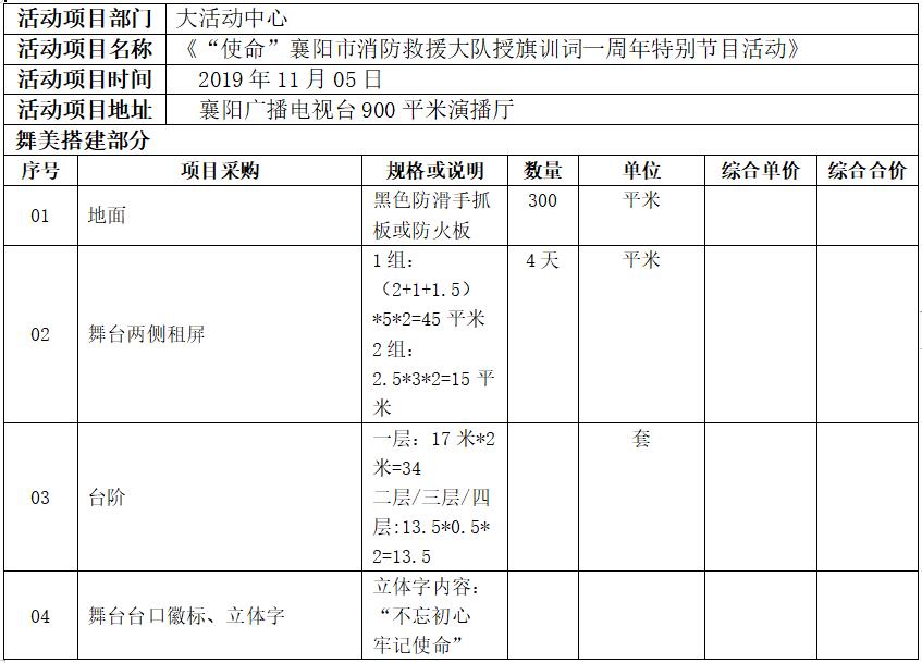 《“使命”襄阳市消防救援大队授旗训词一周年特别节目活动活动》,是由襄阳市消防救援支队主办,襄阳广播电视台承办的活动,现就《“使命”襄阳市消防救援大队授旗训词一周年特别节目活动活动》活动舞美搭建项目面向社会公开采购。