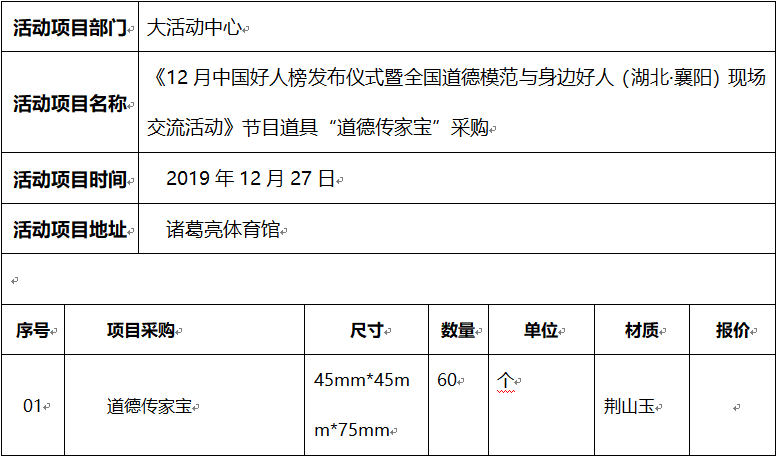 《12月中国好人榜发布仪式暨全国道德模范与身边好人(湖北·襄阳)现场交流活动》,是由襄阳市精神文明办主办,襄阳广播电视台承办的活动,现就 该项活动其中的节目道具“道德传家宝” 面向社会公开采购。