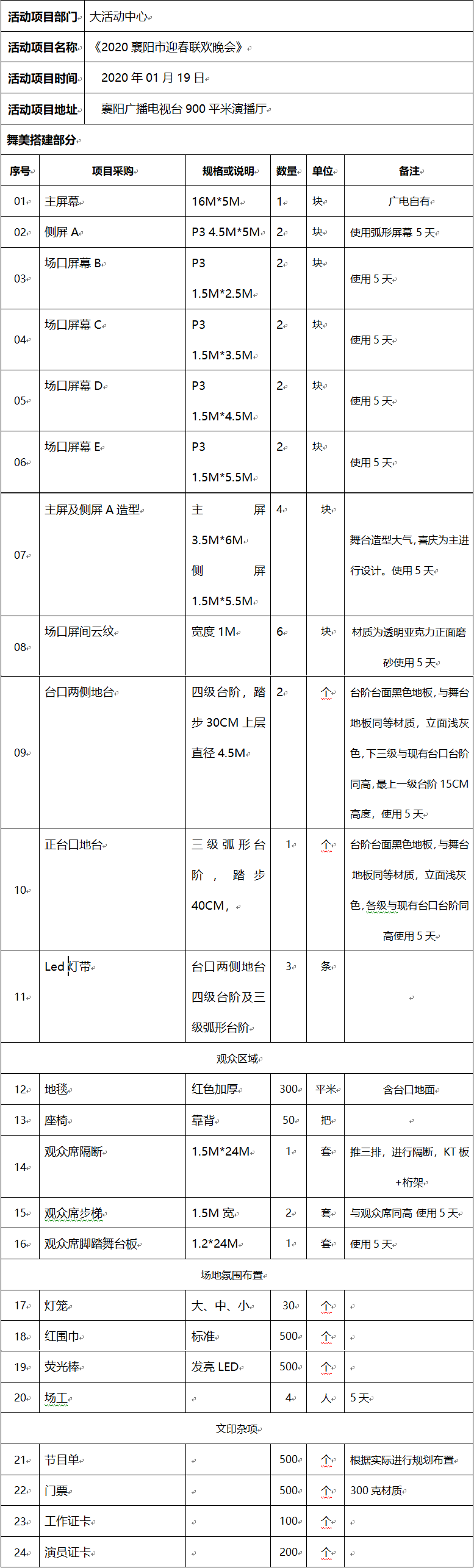 《2020襄阳市迎春联欢晚会》,是由中共襄阳市委、襄阳市人民政府主办,中共襄阳市委宣传部、襄阳市文化和旅游局、襄阳广播电视台承办的活动,现就《2020襄阳市迎春联欢晚会》活动舞美搭建项目面向社会公开采购。