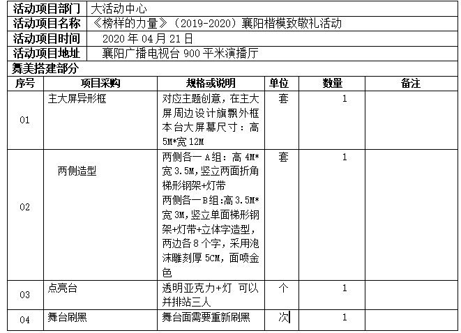 《榜样的力量》(2019-2020)襄阳楷模致敬礼活动,是由中共襄阳市委宣传部主办襄阳广播电视台协办的活动,现就 《榜样的力量》(2019-2020)襄阳楷模致敬礼活动舞美搭建项目 面向社会公开采购。
