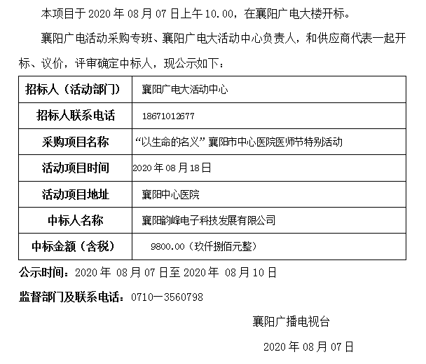 关于公开采购“以生命的名义”襄阳市中心医院 医师节特别活动舞美搭建的中标公示