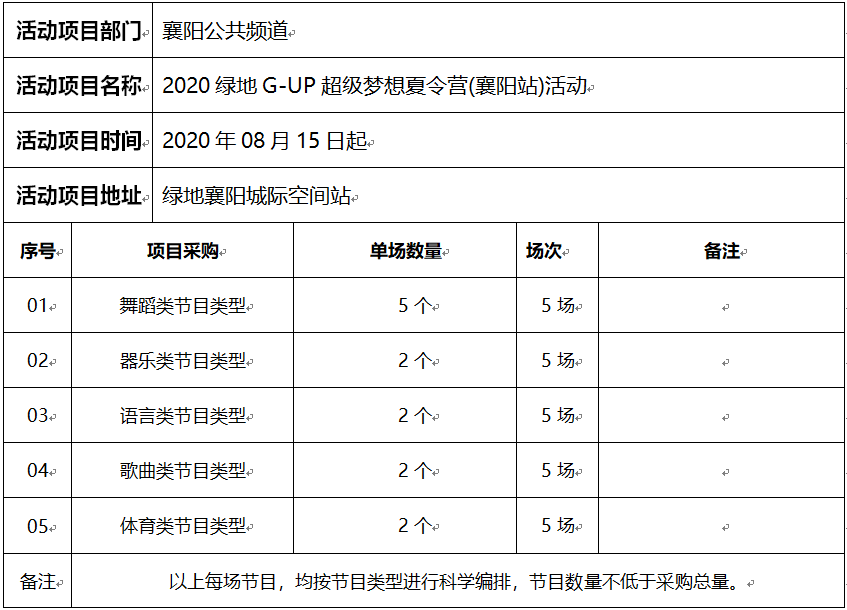 2020绿地G-UP超级梦想夏令营(襄阳站)活动,是由绿地襄阳城际空间站主办襄阳广播电视台公共频道承办的活动,现就2020绿地G-UP超级梦想夏令营(襄阳站)活动节目表演类项目 面向社会公开采购。