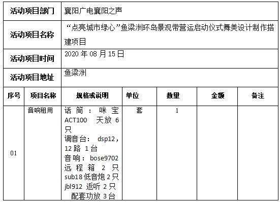 “点亮城市绿心”鱼梁洲环岛景观带营运启动仪式活动,是由鱼梁洲管委会、襄阳一治东园环岛景观建设管理有限公司与襄阳广播电视台联办的活动,现就“点亮城市绿心”鱼梁洲环岛景观带营运启动仪式活动的舞美搭建项目面向社会公开采购。