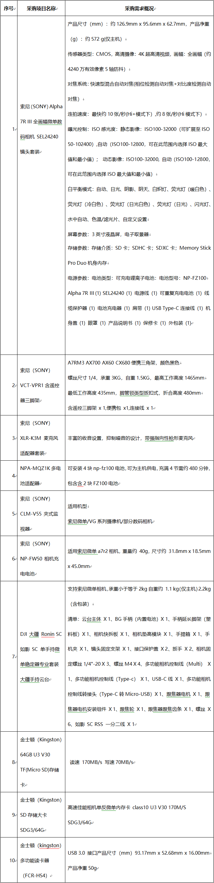 三、商务要求:欢迎具备经营资格,并有供货能力的供应商踊跃报价。有意愿者请递交:1.公司营业执照复印件;2.信用中国网查询的信用报告;3.授权委托书;4.供应商及委托人无贿记录的承诺书;5. 拍摄设备及相关配件报价清单;6.售后服务承诺书等相关资料(以上资料均需盖公章)参与报价(报价需包含硬件组装费、增值税专票税、运输等费用)。