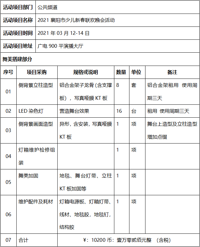 2021襄阳市少儿新春联欢晚会活动,是由襄阳广播电视台主办的活动,现就2021襄阳市少儿新春联欢晚会活动舞美搭建项目面向社会公开采购。