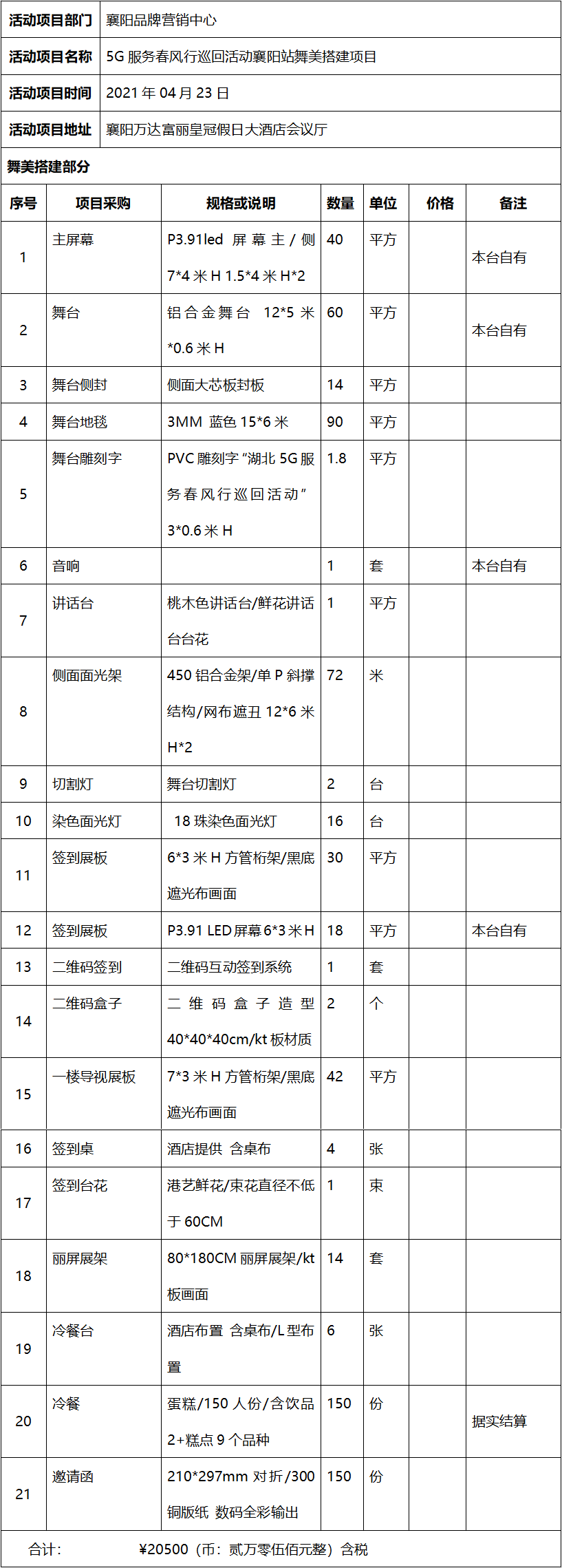 5G服务春风行巡回活动,是由襄阳市政府主办活动,三家通信运营商协办,襄阳广播电视台承办的活动,现就5G服务春风行巡回活动襄阳站舞美搭建项目面向社会公开采购。