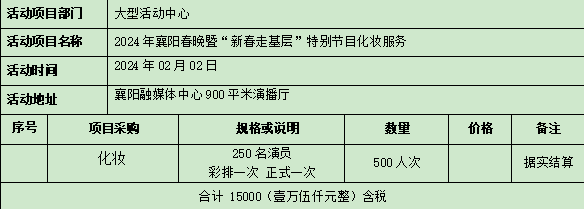 2024年襄阳春晚暨“新春走基层”特别节目是由中共襄阳市委、襄阳市人民政府主办,中共襄阳市委宣传部、襄阳融媒体中心承办的活动,现就2024年襄阳春晚暨“新春走基层”特别节目化妆服务面向社会公开采购。