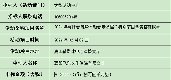 襄阳融媒体中心活动采购专班、襄阳融媒体中心大型活动中心负责人,在“三重一大”监督人员监督下,和供应商代表一起开标、议价,评审确定中标人,现公示如下: