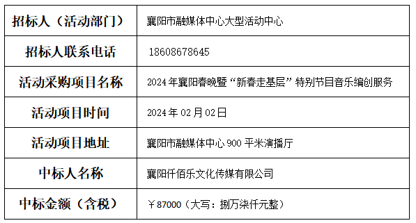 襄阳市融媒体中心活动采购专班、襄阳市融媒体中心大型活动中心负责人,在“三重一大”小组监督下和供应商代表一起开标、议价,评审确定中标人,现公示如下: