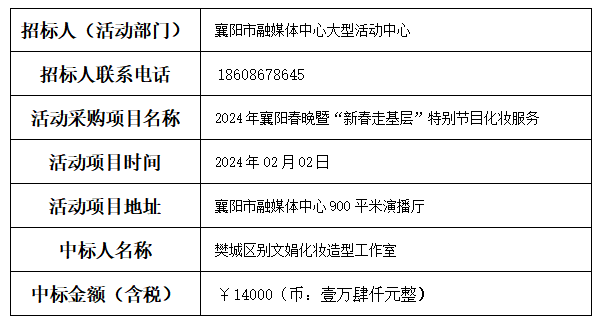 襄阳市融媒体中心活动采购专班、襄阳市融媒体中心大型活动中心负责人,和供应商代表一起开标、议价,评审确定中标人,现公示如下: