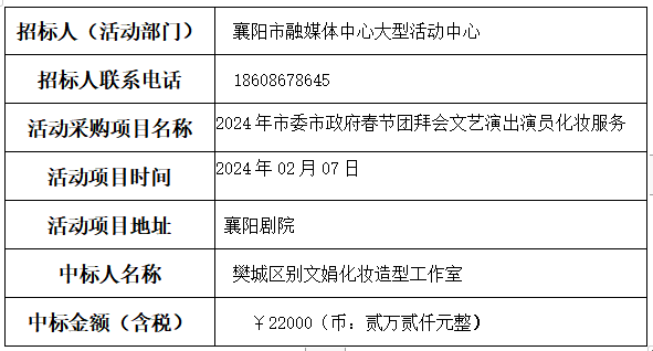 襄阳市融媒体中心活动采购专班、襄阳市融媒体中心大型活动中心负责人,和供应商代表一起开标、议价,评审确定中标人,现公示如下:
