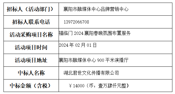 襄阳市融媒体中心活动采购专班、襄阳市融媒体中心品牌营销中心负责人,和供应商代表一起开标、议价,评审确定中标人,现公示如下: