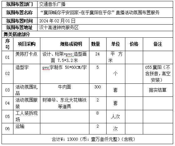 根据湖北交投襄阳文旅发展有限公司与襄阳市融媒体中心的合作协议,现就“襄阳喊你平安回家-在乎襄阳在乎你”直播活动氛围布置服务面向社会公开采购。