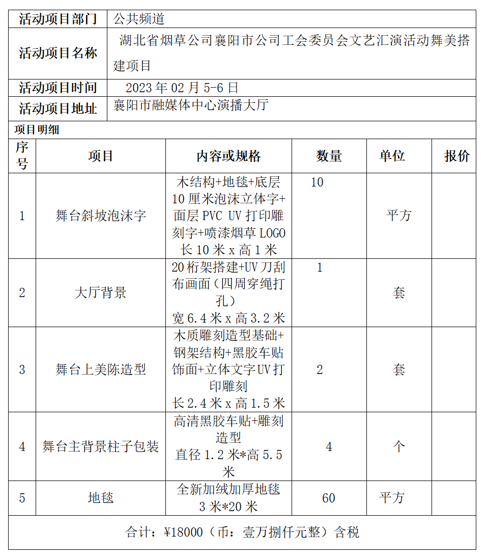 湖北省烟草公司襄阳市公司工会委员会文艺汇演活动,是由襄阳市烟草局主办、襄阳市融媒体中心承办的活动,现就湖北省烟草公司襄阳市公司工会委员会文艺汇演活动舞美搭建项目面向社会公开采购。