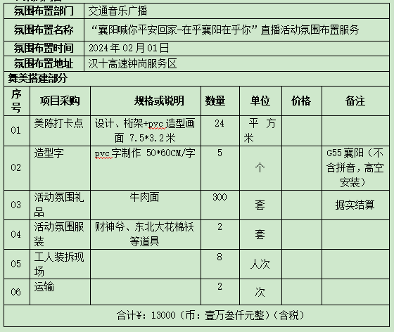 因在规定时间内应标供应商数量不够,现根据湖北交投襄阳文旅发展有限公司与襄阳市融媒体中心的合作协议,就“襄阳喊你平安回家-在乎襄阳在乎你”直播活动氛围布置服务面向社会公开二次采购。