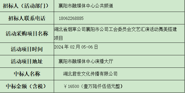 襄阳市融媒体中心活动采购专班、襄阳市融媒体中心公共频道负责人,在和供应商代表一起开标、议价,评审确定中标人,现公示如下: