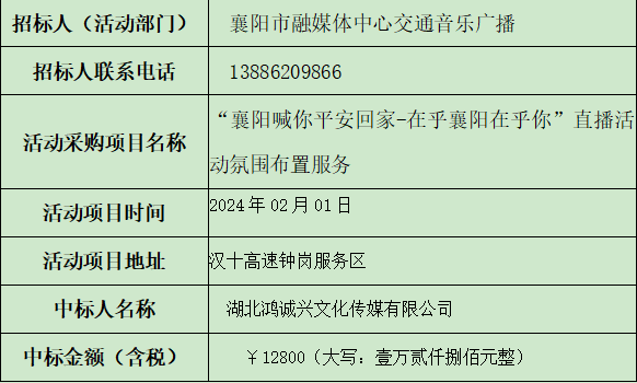 襄阳市融媒体中心活动采购专班、襄阳市融媒体中心交通音乐广播负责人,和供应商代表一起开标、议价,评审确定中标人,现公示如下: