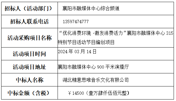 本项目于2024年03月11日上午10:30,在襄阳市融媒体中心大楼开标。襄阳市融媒体中心活动采购专班、襄阳市融媒体中心综合频道负责人,和供应商代表一起开标、议价,评审确定中标人,现公示如下: