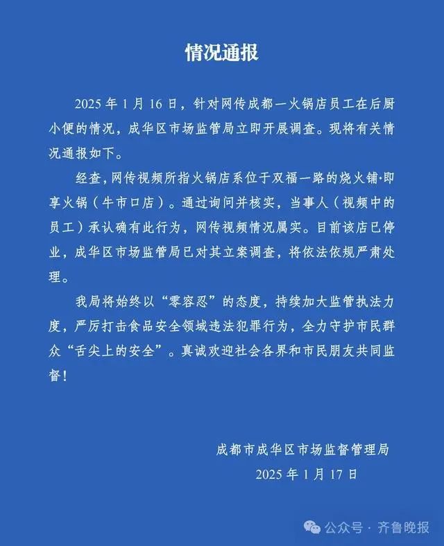 近日,成都一家火锅店被曝员工在后厨小便的视频,引发关注。1月18日,记者从成都市成华区市场监督管理局获悉,视频情况属实。目前该店已停业,已对其立案调查,将依法依规严肃处理。【阅读详情】