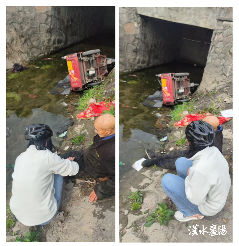 3月5日上午10点半左右,王艳和刘丰羽骑行至小河镇天利粮油有限公司附近时,发现路边一位村民焦虑地挥手呼救。两人立即停下车跟随村民前往查看,发现一位老人连同三轮车从约3米高的小桥翻入沟中,情况十分危急。