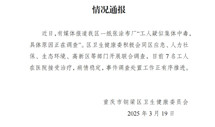 3月19日,重庆市铜梁区卫健委发布情况通报:近日,有媒体报道铜梁区一纸张涂布厂“工人疑似集体中毒,具体原因正在调查”。区卫生健康委积极会同区应急、人力社保、生态环境、高新区等部门开展联合调查,目前7名工人在医院接受治疗,病情稳定,事件调查处置工作正有序推进。