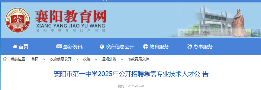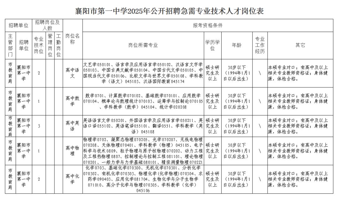 根据《事业单位公开招聘人员暂行规定》(原人事部令第6号)、湖北省人力资源和社会保障厅《关于进一步规范全省事业单位公开招聘工作的若干意见》(鄂人社发〔2016〕23号)文件精神,襄阳市第一中学面向社会公开招聘急需专业技术人才。现将招聘有关事项公告如下:
