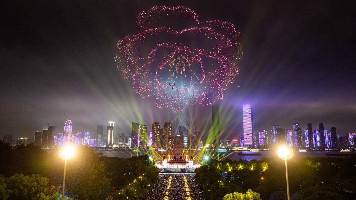 江边,数智编钟与交响乐碰撞出千年回响;江心,智能焰火随音乐律动,绘出“水火交融”的科技诗画;夜空,4000架无人机描摹“花开中华”的壮丽图景,两岸楼宇光影也与之共舞,绘就一幅盛世华章。