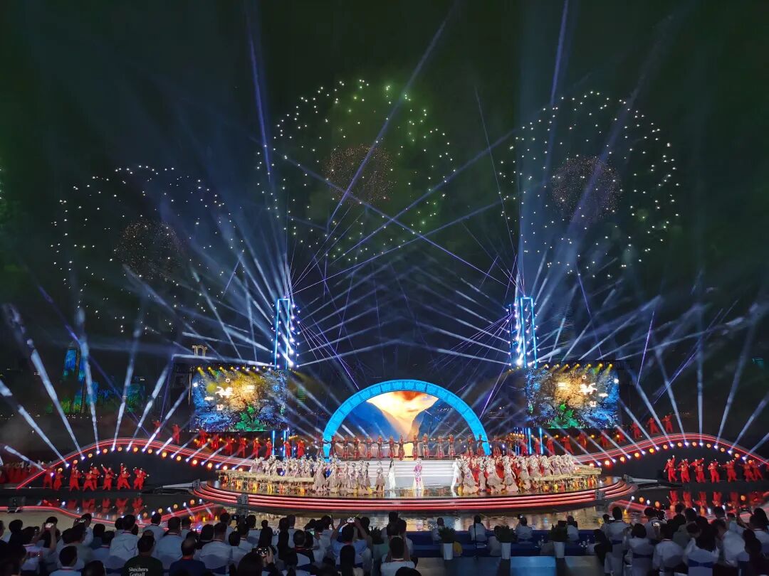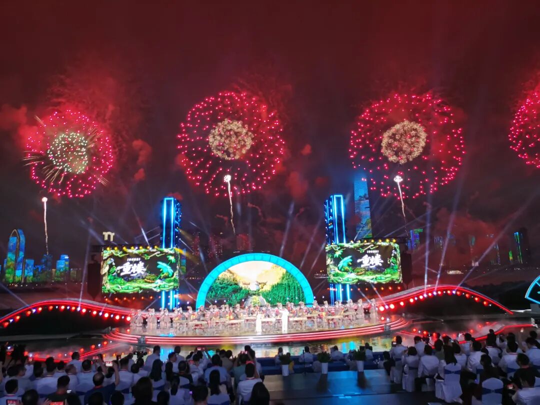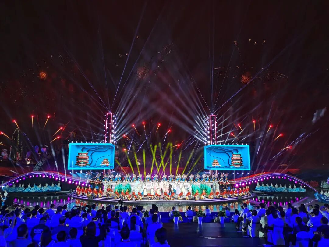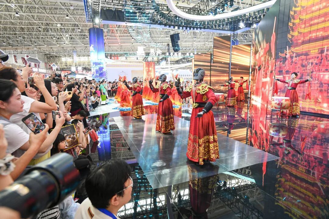 武汉馆上演《星汉耀江城》大秀,身着华美服饰的人形机器人和演员一起跳起凤凰舞。