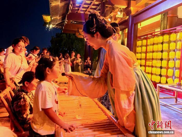 9月5日,长沙杜甫江阁“喜相逢”唐风互动夜游活动中,演员正在与观众互动。 张雪盈 摄