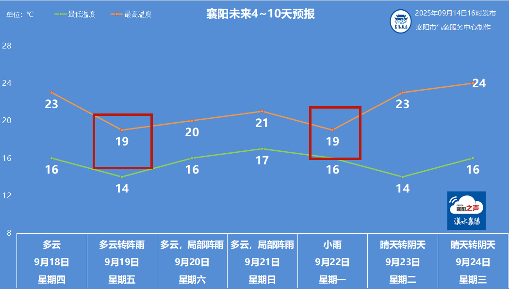 19日至21日,阴天有阵雨,最高气温18~20℃,最低气温16-18℃。