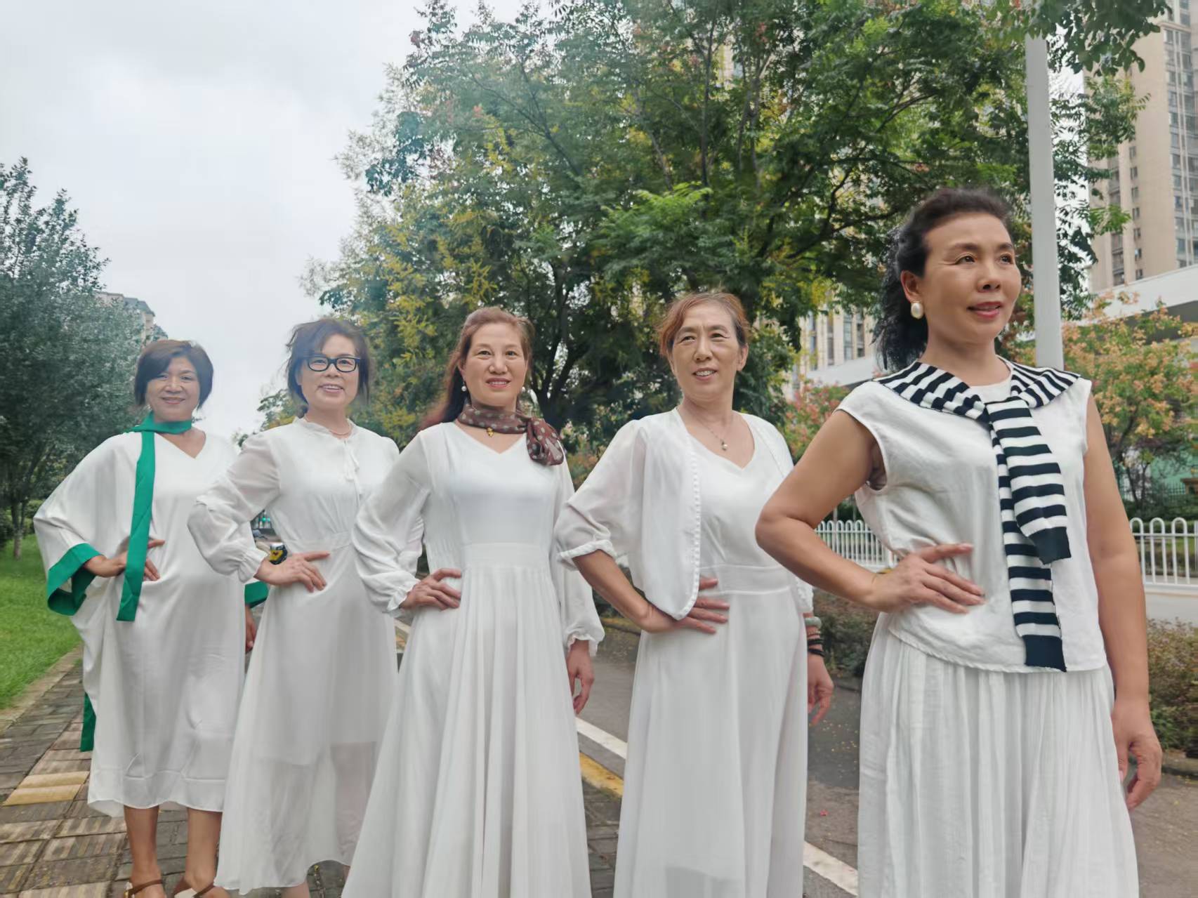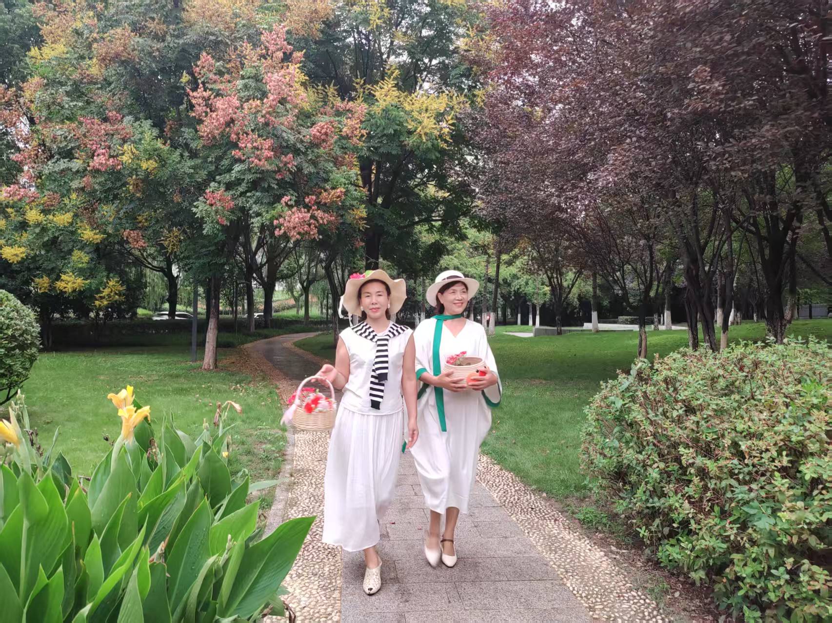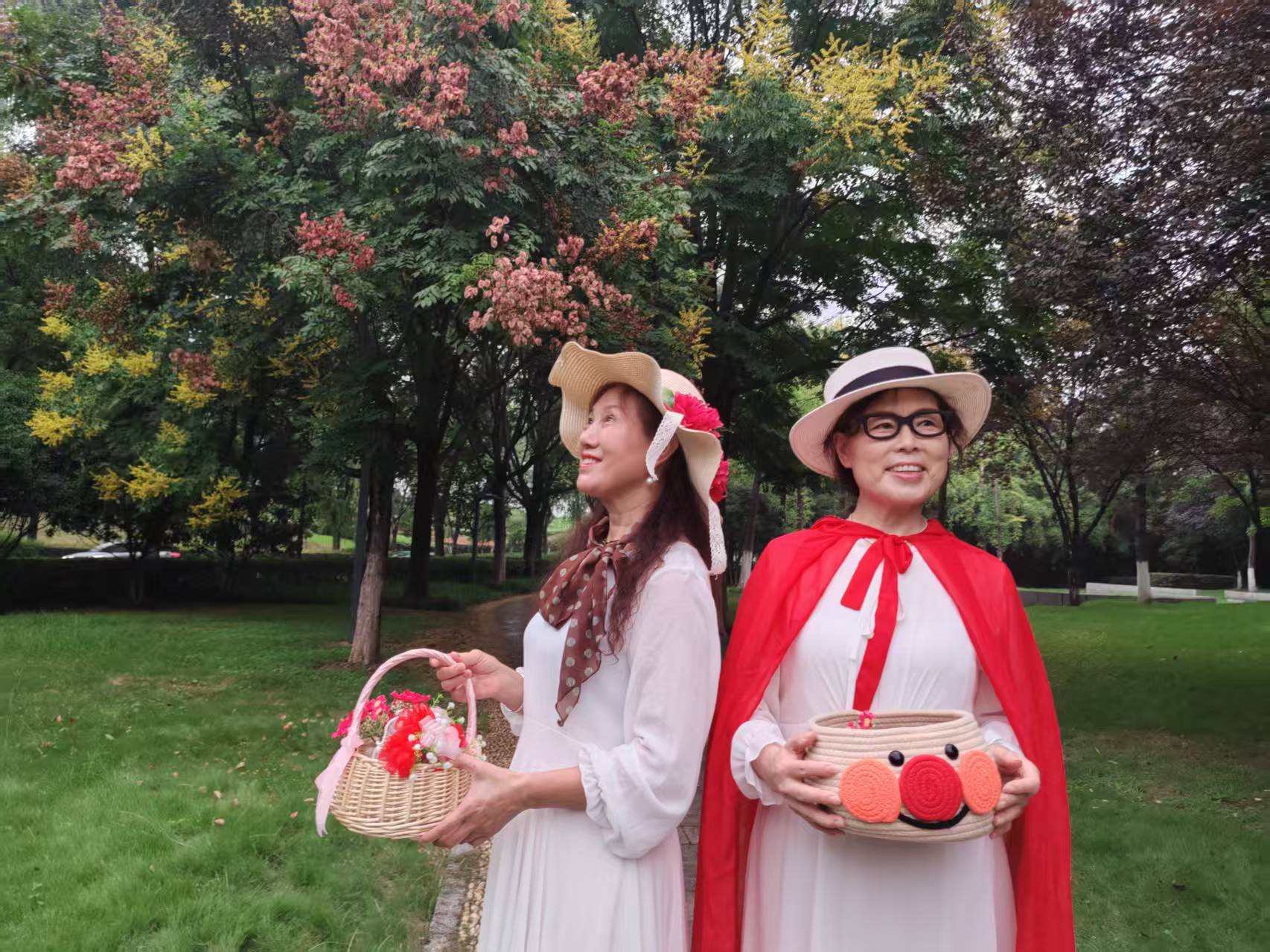 襄城滨湖社区老年大学教学点形体模特班教师江虹说:“现在正是栾树开花结果的时候,叶子是绿色的,花是黄色的,果是红色的,然后再搭配我们白色的衣服,五彩斑斓。”