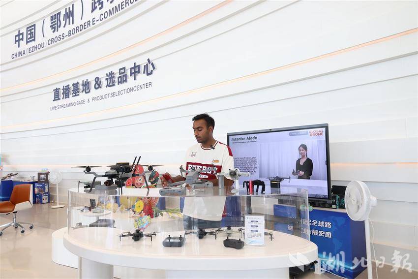 鄂州跨境电商产业园,一名外籍主播正在向外推介国产无人机。湖北日报全媒记者周鹏摄