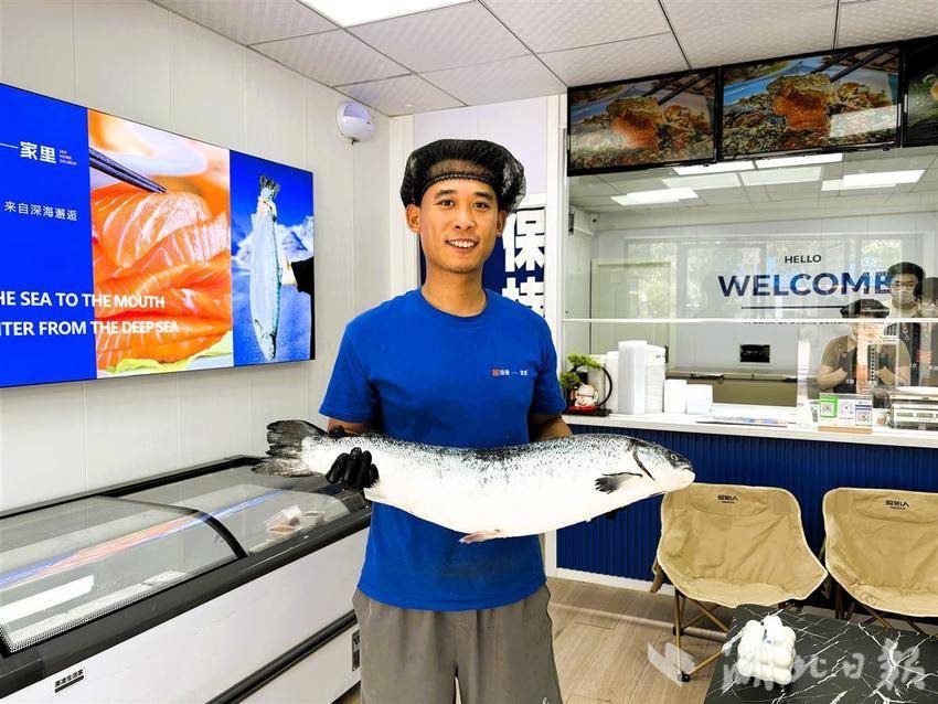 海里家里鄂州店老板卫国锋展示刚收到的新鲜挪威三文鱼。湖北日报全媒记者周鹏摄