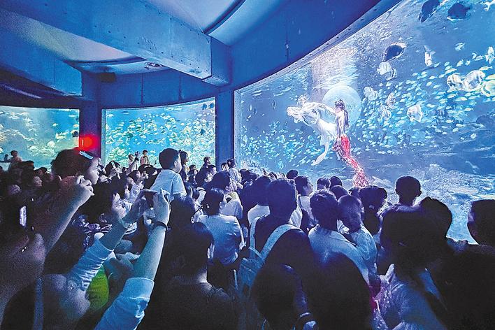10月3日,海合安武汉极地海洋度假区推出创意表演“水下嫦娥奔月”。(湖北日报全媒记者 倪娜 通讯员 徐平丽 摄)