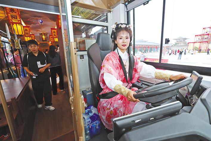 10月5日,襄阳公交车司机姚玲玲装扮成“黄蓉”,载着游客来到襄阳唐城景区。(视界网 杨东 摄)