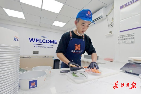 海里家里鄂州店老板卫国锋在将切好的三文鱼装盘。 长江日报记者史伟 摄
