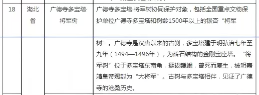 ■ 近日,国家文物局办公室、国家林草局办公室、住房城乡建设部办公厅联合公布第一批“国保单位·古树名木”协同保护名录,包括协同保护对象共28个。其中,拥有1500年以上树龄的襄阳广德寺多宝塔“将军树”上榜。【阅读详情】